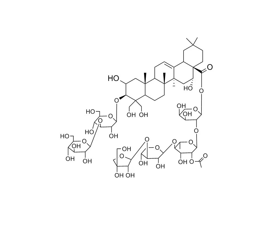 【英文別稱】 Olean-12-en-28-oic acid, 3-[(3-O-β-D-glucopyranosyl-β-D-glucopyranosyl)oxy]-2,16,23,24-tetrahydroxy-, O-D-apio-β-D-furanosyl-(1→3)-O-β-D-xylopyranosyl-(1→4)-O-2-O-acetyl-6-deoxy-α-L-mannopyranosyl-(1→2)-α-L-arabinopyranosyl ester, (2β,3β,16α)-